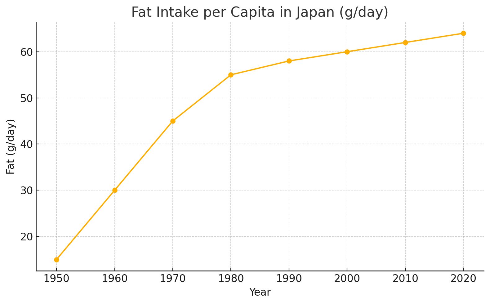 脂質摂取量は、戦後右肩上がりに増えています。最新のデータでも60g/日は超えています