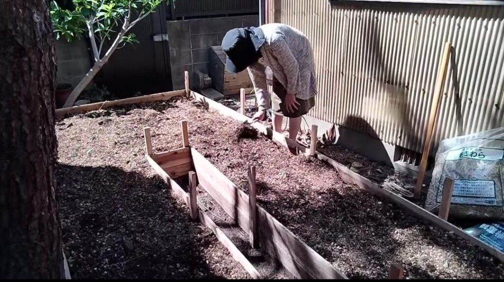 先に有機物を敷き込んでおくことで、土の量を大幅に軽減することが出来ます。