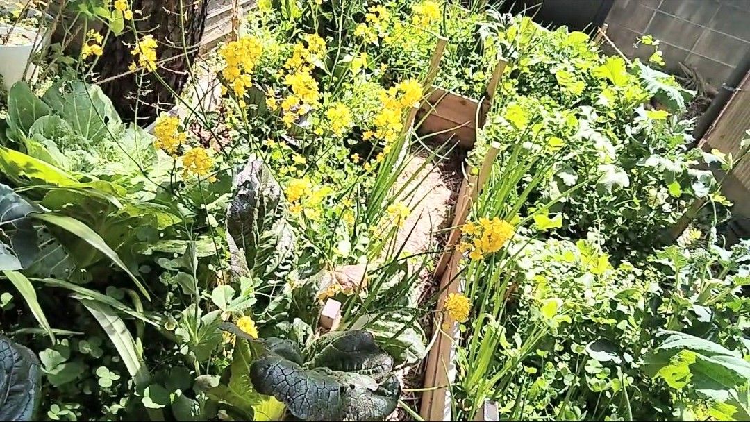1シーズンくらい経つと、野菜、ハーブ、花などが茂ってきました。私たち好みのワサワサした感じです。