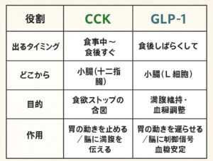 〇よく噛むことで、「満腹ホルモン(CCK や GLP-1 )」が増えやすい